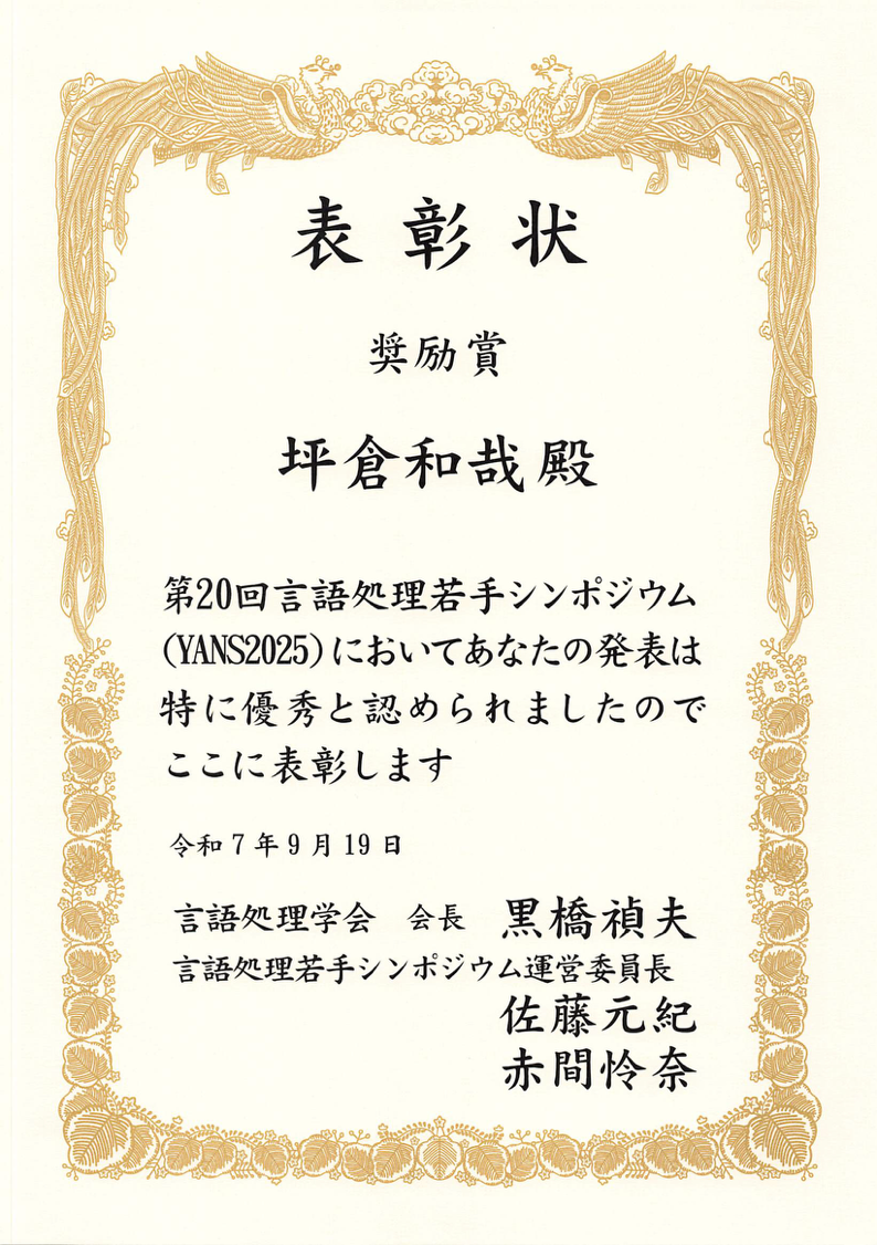 カメリアドラゴンズの坪倉和哉(情報科学研究科博士後期課程3年)さんが、9月18日、19日の2日間に渡り開催された第20回言語処理若手シンポジウム(YANS2025)で奨励賞を受賞しました。なお今年度のシンポジウムでは、対象論文246件の中で24件が奨励賞を受賞しています。