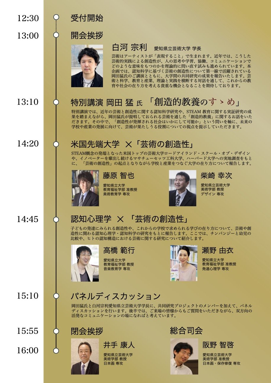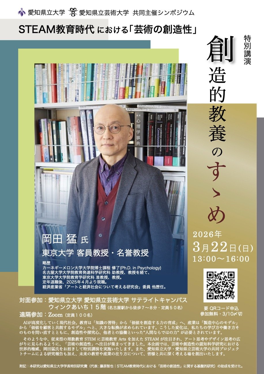 2026年3月22日(日)、愛知県立大学・愛知県立芸術大学の共同主催による、STEAM教育をテーマにしたシンポジウムを開催します。特別講演では、芸術の創造性に関わる認知科学研究の世界的権威、岡田猛先生(東京大学 名誉教授・客員教授)にご登壇いただきます。その後、2大学チームによる研究発表と、パネルディスカッションを行います。