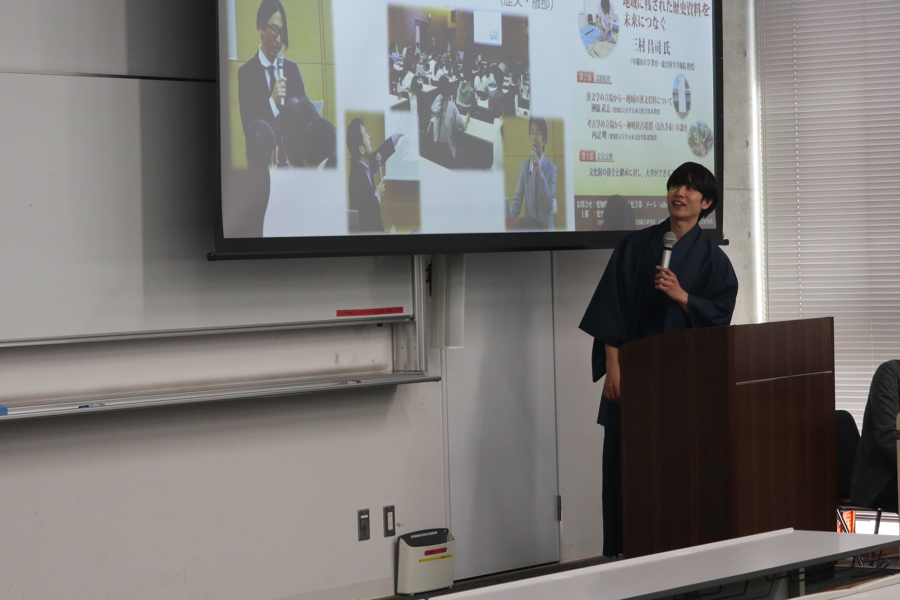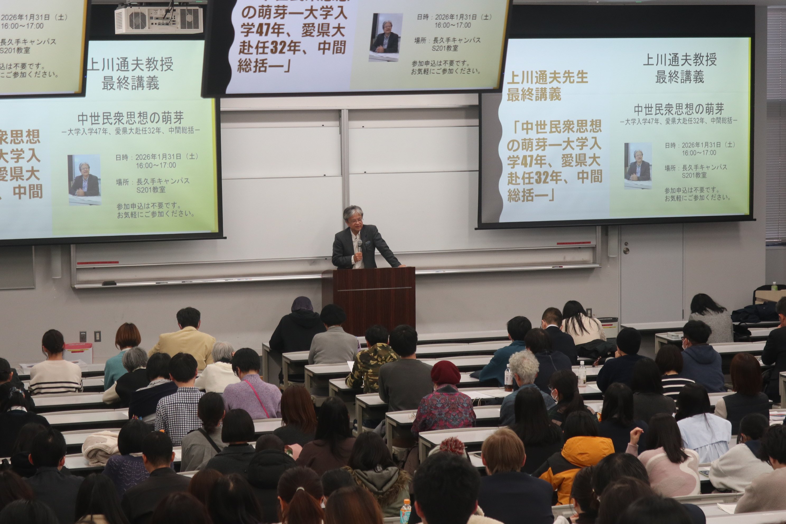 第二部では、今年度末に定年退職を迎えられる歴史文化学科・上川通夫教授最終講義「中世民衆思想の萌芽―大学入学47年、愛県大赴任32年、中間総括―」を開催しました。上川教授はご専門である日本中世史において、国家が仏教による体制を構築しようとする仏教史、また民衆は仏教思想を権力に対抗する手段とし人として生きる意味を見出す表現であったする中世民衆史につながる研究を元にした講義をされました。また、在任中に関わった県史・市史編さん事業や学生と立ち上げた中世史研究会の活動、スペイン、ブラジル、ウズベキスタンへの渡航など大学教員としての32年間を総括されました。講義には、多くの卒業生を含め150名以上の聴講があり、興味深く、有意義な時間となりました。