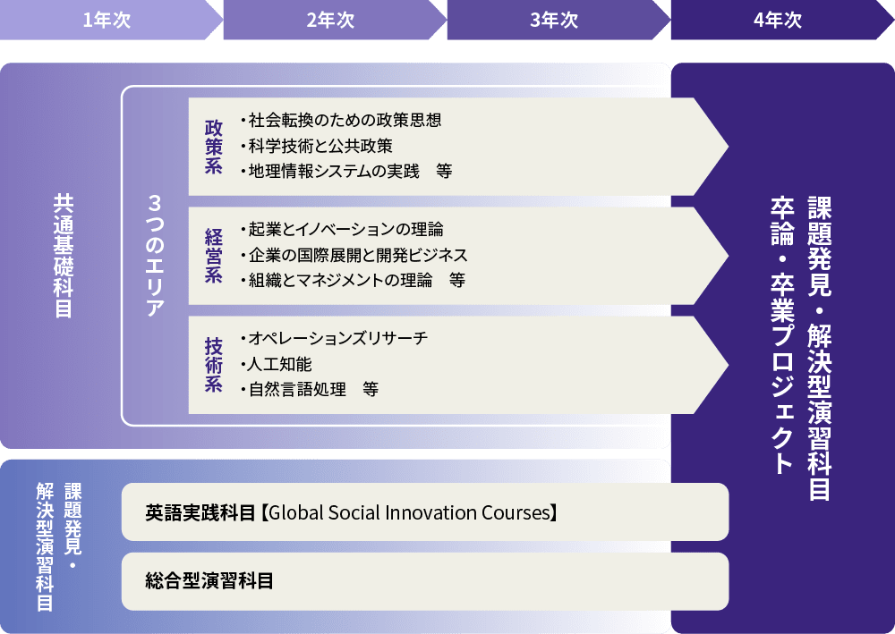 1年次では、情報技術、言語スキルや経営学・政策科学の基礎を学ぶとともに、実際の社会の現場から課題発見・探究のための視点や方法を学びます。2年次からは学生自身が3つのエリアから主とする学びを選択し、【エリアコア科目】で学びを深め、その学びを【Global Social Innovation Courses】において英語実践へとつなげます。3・4年次には、学外機関等との連携による実践的な活動を通じて、具体的な課題解決提案に繋げる力を身に付けます。
