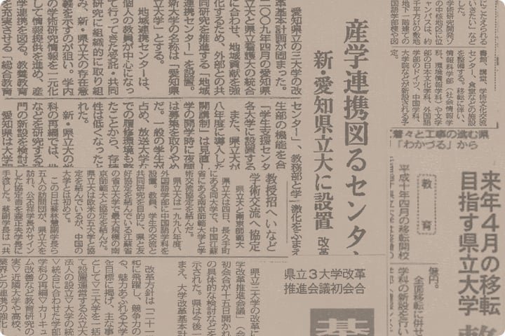 愛知県立大学に関わる新聞記事、記者発表資料の内、興味深いものを集めました。愛知県立大学を取り巻く環境、地域、行政との関わり、時代の移り変わりがよく分かるものばかりです。是非ご覧ください。