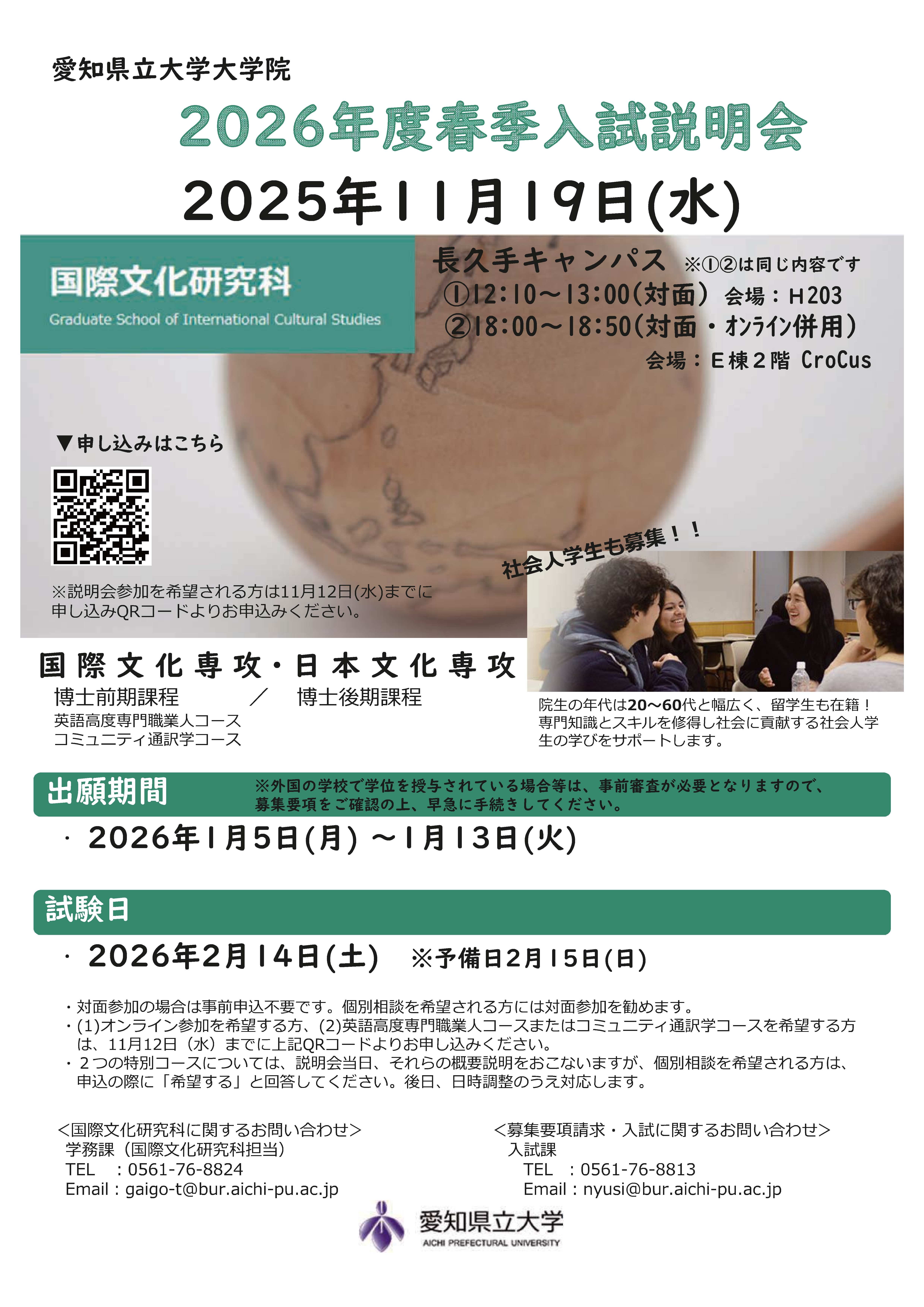 令和8(2026)年度入試 大学院国際文化研究科春季入試説明会を開催します