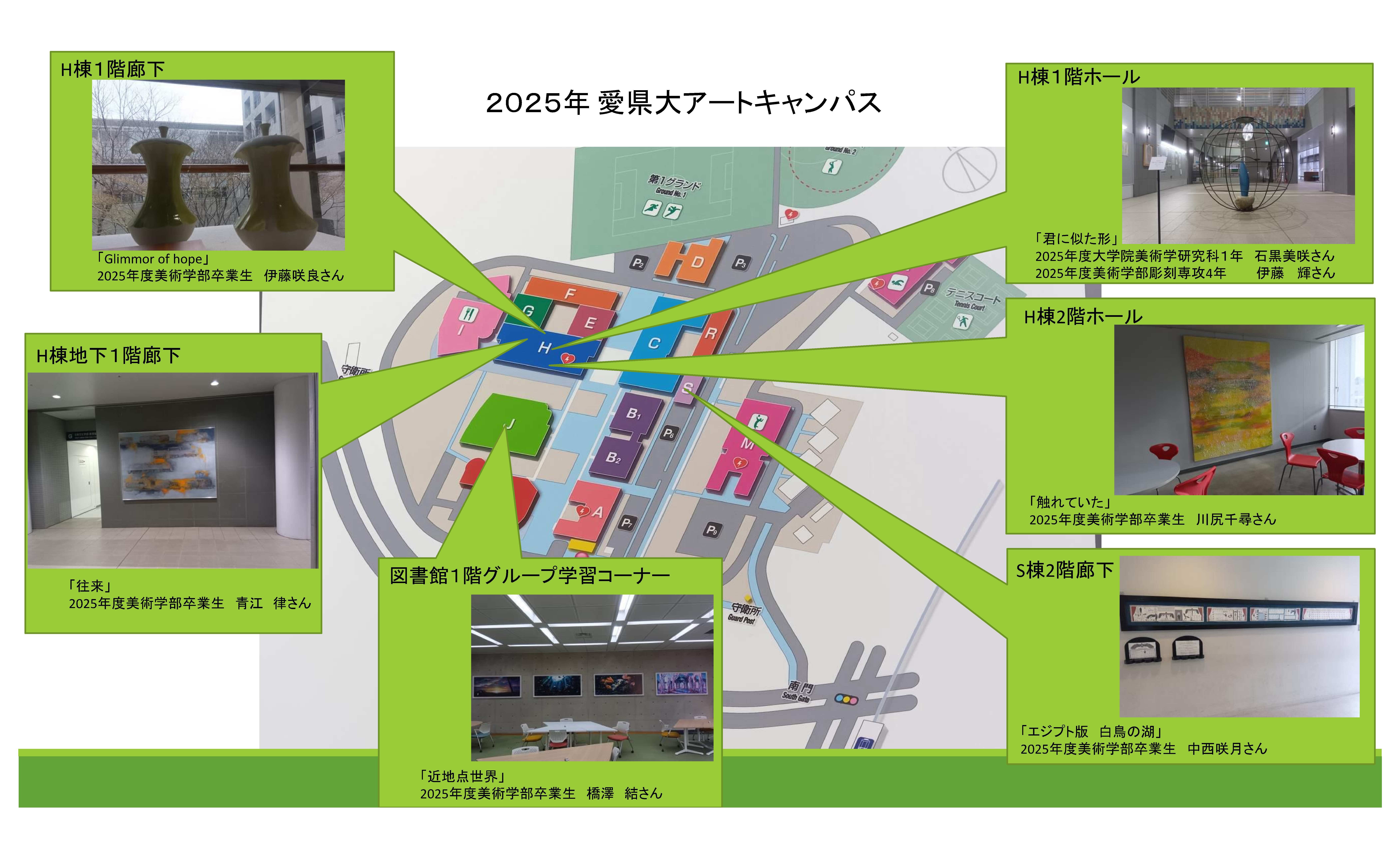 愛知県立芸術大学との連携の下、キャンパス内を芸術作品で彩ろうという取り組みを進めています。2025年度は、美術学部彫刻専攻の森北 伸教授の指導の下、大学院美術専攻の石黒 美咲さんと美術学部彫刻専攻の伊藤 輝さんが、H棟ホールにふさわしい作品を、県大生の現状をモチーフにして制作してくれました。また、2025年度愛知県立芸術大学卒業・修了制作展に出品された作品のうち、絵画やイラスト、陶磁器といった5作品をキャンパス内に展示しました。